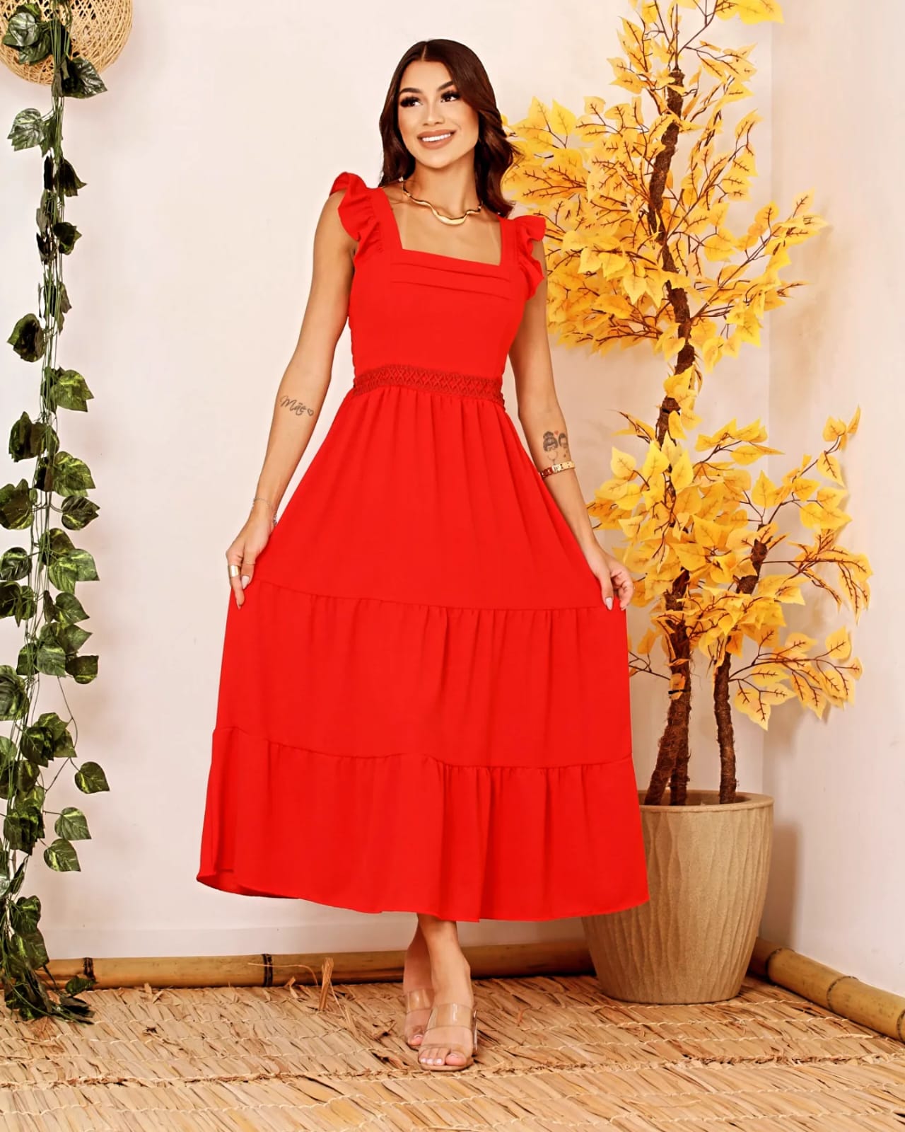 Estes vestido midi liso com alças com babado